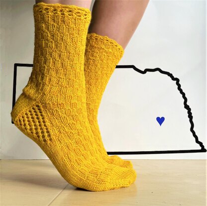 Goldenrod, sunflowers, tractors, and corn. Living the farm life in Nebraska! This sock is top down, with a lace cuff and lace insert in the gusset.