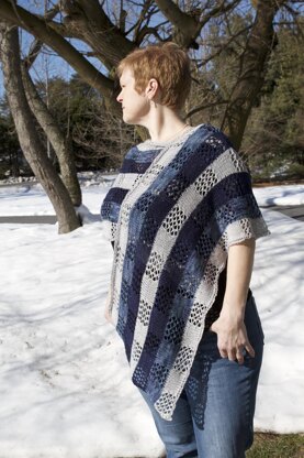 Needs More Blue is a lightweight large stole which uses three different colors of yarn. Its size means it can be wrapped more than once for warmth, but its light weight means it’s perfect for those don’t-quite-need-a-coat days. It’s named for my dear friend Maureen’s favorite yarn shopping phrase.