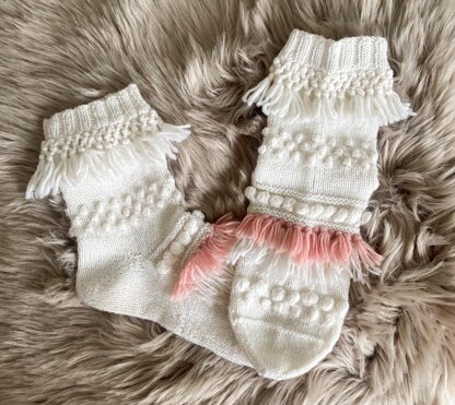 Miss Summerhay is a pair of adorable socks that make you want to dance in flower meadows at midnight. The fringes are made while knitting the socks, so the yarn does not need to be cut separately for the fringes!