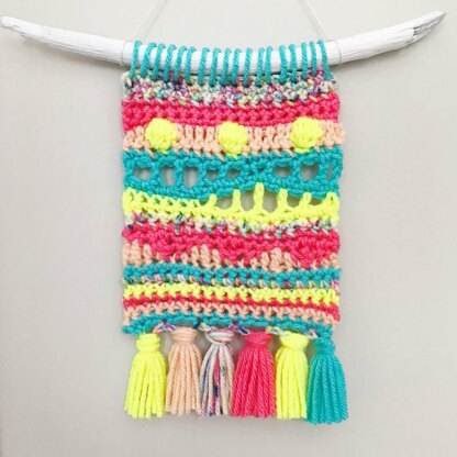 Adorn your wall with style and cuteness, while using up yarn from your stash with this crocheted mini wall-hanging! This is an easy level crochet pattern that uses slip stitch, single crochet, half double crochet, treble crochet and bobble stitch. A written tutorial is included in the PDF file for the bobble stitch. This crochet tapestry is perfect for an apartment space, kids room, or just about anywhere!