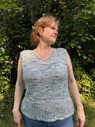 Neskowin Top is a top-down, saddle shoulder construction top. It features a v-neck, lacy shoulders, and a lace hem whose depth you can customize to your liking.