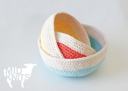 These multifunctional color blocked nesting bowls are crocheted using brightly colored cotton yarn making them useful and washable. The three sizes of bowls ensure you will have the perfect size to hold all your bits and pieces as super useful catchalls. You can also use these bowls as gorgeous vessels to display air plants around your home. This written pattern includes detailed instructions to crochet three sizes of bowls.