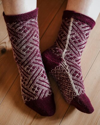 This sock knitting pattern was inspired by late medieval tablet-weaving bands, incorporating the unique and elaborate designs found in this historical weaving technique.