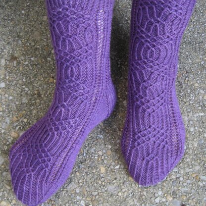 This pattern is for a pair of cluster (“smocked”) socks. The stitch itself is a Japanese stitch that is just perfect for socks. There’s enough “give” to make them comfortable, but enough unusual cabling to make them interesting to look at and fun to knit. A small amount of faggotting is added to insure a good fit.