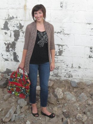 This is the New York Cardigan. I call it the New York Cardigan because I knit up the sample for myself while visiting my sister, brother in law, and my new baby niece in New York and New Jersey! It is a very versitile design that is worn open with a camisole underneath. It is light enough for spring, and perfect for layering in the winter. It is also cute worn with a belt over your favorite dress in the fall. It can be knit in extra small (fits a bust size of 28 - 34in.), small (36-40), medium (42-44), large (46-50), or extra large (52-55). Shown here in XS (truffle - brown) and S (amethyst - purple) There are two sleeve options - short, and 3/4 length.