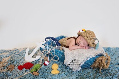 This crochet pattern gives you the instructions, so that you can make a fisherman hat, suspenders, fishing pole and little amigurumi fish. Perfect photo prop for every little boy and girl! Great for any newborn photo session!