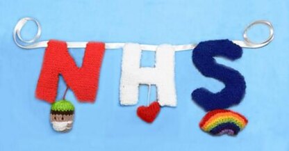 This pattern is of a NHS garland. The garland features the letters, N, H and S and have motifs of a Doctor in scrubs, a heart and a rainbow. This garland style decoration looks gorgeous hung up or draped across a window.