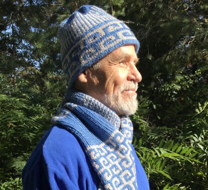 This hat/scarf set knit features the classic greek key design. The “key” pattern is worked using the mosaic knitting technique. The hat includes a double layer over the ears for extra warmth. The scarf is worked in several stitch patterns, as well as the same charted greek key design. Charted instructions included
