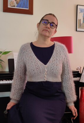 The lace pattern is explained by charts, for each size and each part of the body. It can be easily memorized, as it is rather repetitive. The bottom hem of the body and the sleeves is worked in twisted rib. An icord is worked all along the neckline and forms the buttonholes.