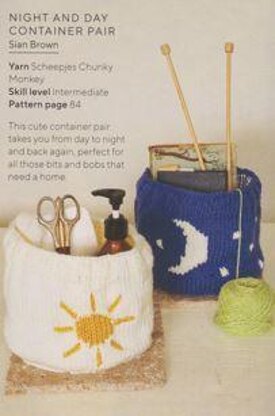 This is a pattern for Night and Day Containers, originally published in Knitting magazine. The bases are knitted as a circle, flat with make 1 stitch increases, the sides stocking stitch with intarsia motifs. Embroidery is added, and the borders are 2 x 2 rib. Lining and wadding are used. Photos Knitting magazine.