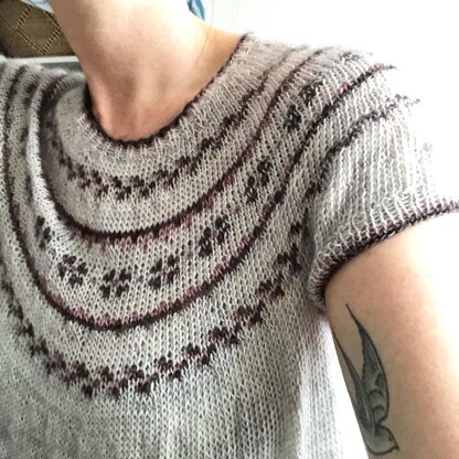 This feminine top down yoke sweater features three colors, and is a perfect opportunity to dip your needles into three color stranded color work.