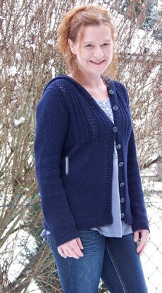 Größen: 32 (34, 36, 38) (40, 42, 44) 46 passend für einen Brustumfang von 80 (85, 90, 95) (100, 105, 110) 115 cm; Die Jacke wird mit einer Maßzugabe von 2,5 cm getragen. Die auf dem Foto gezeigte Größe ist eine 38 mit einer 93 cm Brust. Fertige Maße:Brust: 82 (87, 92, 97) (102, 107, 112) 117 cm Taille: 75 (80, 84, 90) (95½, 99, 105) 108,5 cm Hüftumfang: 87 (91½, 95½, 101) (107, 110½, 116½) 120 cm Gesamtlänge: 55½ (56½, 57, 57½) (58¼, 59, 59½) 60½ cm Tiefe des Armausschnitts: 16½ (17½, 18, 18½) (19¼, 20, 20½) 21½ cm Ärmellänge: 43¼ (44½, 46, 46) (46½, 46½, 46½) 46½ cm Oberer Armumfang: 30½ (30½, 31, 33) (35½, 38, 40½) 43 cm Material: Garn: Sidney von Fischer Wolle (50g /105 m) 11 (11, 12, 13), (13, 14, 15), 15 Knäul. Farbe auf dem Foto: "Marine". Stricknadeln: 4,5 mm Rundstricknadel und 4 mm Rundstricknadel. Falls für die Ärmel gebraucht werden: ein Nadelspiel 4,5 mm und 4 mm. Sonstiges: Maschenmarkierer, Wollnähnadel, evtl.