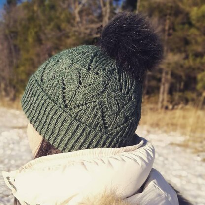 Niila at the mountains is a lightweight springtime beanie. It combines lace and cable stitch. The folded brim protects the ears from the cool springtime winds.