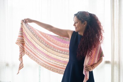 This is an asymmetric wrap worked in one piece. The design uses the simple garter stitch to play around with colours and drop stitch rows to create a breezy, yet cozy, shawl.