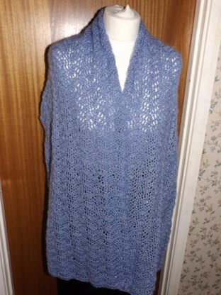 Wavy wrap, worked in James Brett Aria or any VERY lightweight DK yarn. Stitches used are chain and trebles. 4 balls of Aria required. One size. English abbreviations