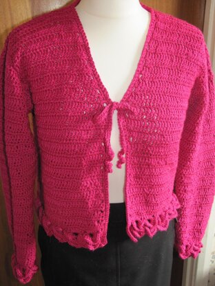 This pattern uses English abbreviations. Crocodile stitch edged bottom and cuffs. Main body is worked in trebles, with a double crochet edge.