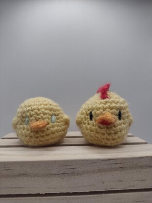 Pattern for a little chick, with additions for an adult chicken. The only sewing involved is to attach yarn for surface crochet (comb, beak), and adding eyes (and wattle for an adult hen), and maybe a keyring or ribbon loop for hanging.