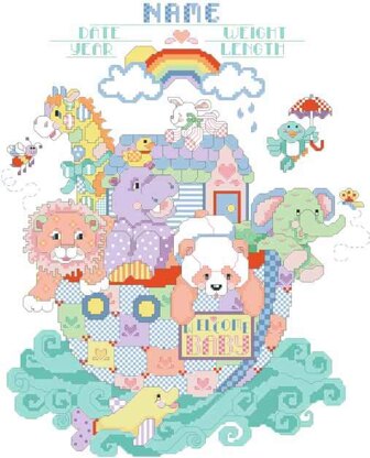 By Linda Gillum. Welcome baby with this cheerful and lively ark full of patchwork and patterned animals. This design is super cute with an adorable array of giraffe, hippo, dolphin and more delightful animals. Up-to-date baby colors will look great in the new nursery.