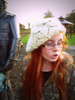 The beret, available in three sizes and shown here in medium, is suitable for a child or adult, depending on how you prefer to wear the hat. For the most slouch, choose the large size.The hat is knit from the top down, starting with a short icord and ending with an icord brim, which fits snuggly. The hat, knit in the round, increases with yarn overs at the crown, before flowing into the chevron lace. This concentric crown and petal lace give the hat its name, Nóinín or in English, Daisy!