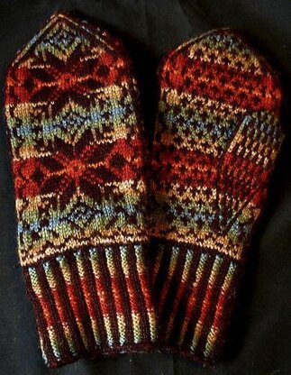 These mittens follow the classic style of the two-color Selbu mittens of nineteenth-century Norway: a corrugated ribbing, large star motif (known in Norway as an "eight blade rose," pointed tips, designated seam stitches, and a different small motif worked on the palm, thumb gussets, and thumb; The many colors used in this pair give the mittens the rich look of tapestry, yet only the background colors change during knitting. Some knitters have chosen to use a space-dyed yarn for the background shading rather than the multiple colors listed in the pattern. These mittens are meant to be knitted firmly for warmth. Gauge: 9 sts and 9 rounds/inch. Color charts, glossary, and reading list included.