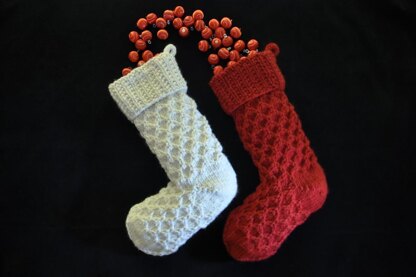 A rich stocking with enough body to hang beautifully by the fireplace, showcasing a texture reminiscent of heavy fisherman sweaters. Because it is knit in a bulky weight yarn this project is both quick and satisfying. The smocked honeycomb stitch pattern of the main body gives dimension and depth without requiring intricate cabling or complex stitch patterns. This seamless stocking makes a great weekend project for an intermediate knitter or a first sock project for a transitioning beginner