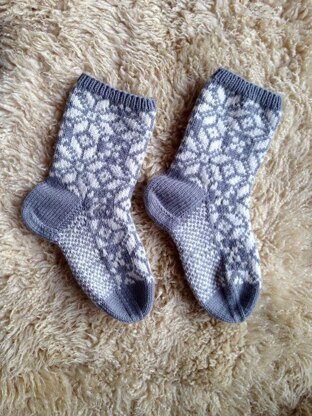 Von den traditionellen Norwegermotiven, die zwar aus ganz einfachen Elementen bestehen, aber doch kompliziert zusammengestellt sind, kann man nie bekommen. Wirklich erstaunlich, wie viel Verschiedenes sich aus nur zwei Farben zaubern läßt! Diese Socken sind eine kürzere Version der traditionellen Herrenkniestrümpfe. Für die Musterung wurde ein in Norwegen als „achtblättrige Rose“ bekanntes Motiv zur Grundlage genommen und mit kleineren Elementen zu einem ansprechenden Flächendesign aufgefüllt. Die Sohle wird durch abwechselndes Stricken in Haupt- und Kontrastfarbe besonders lauffest.