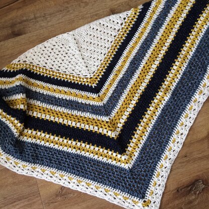 The Norfolk Stripes Shawl is made with a coastal inspired colour palette of dark blue, denim blue, English mustard and cream. With a variety of stitches, it’s interesting to work and with the 5mm hook, it grows quickly. The larger hook size also encourages drape.