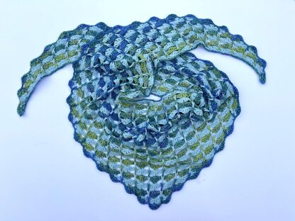 Finished dimensions: Finished shawl has a span of 145cm/57 inches & a depth of 37cm/14.6 inches (after blocking & not including tassel).