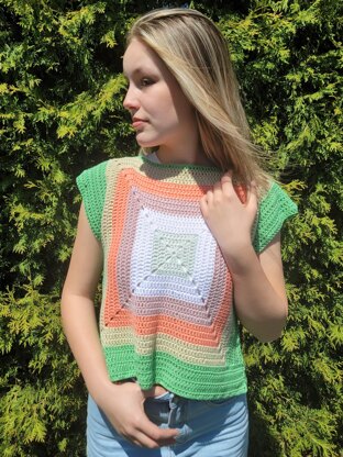Why should I make this? The Not so granny tee is a beginner-friendly wearable suitable for all shapes and sizes. Its simple construction and assembly mean you’ll be showing off your love of the classic granny square to the world in no time.