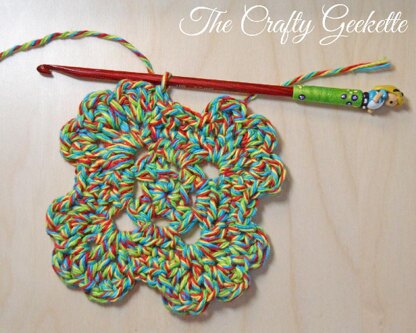 The Not So Square Granny is a 4" motif designed to be joined as you go. It works up quick and only uses basic stitches making it perfect for beginners. If you are unfamiliar with the join-as-you-go method of attaching motifs, Youtube has many video tutorials for for several join-as-you-go methods.
