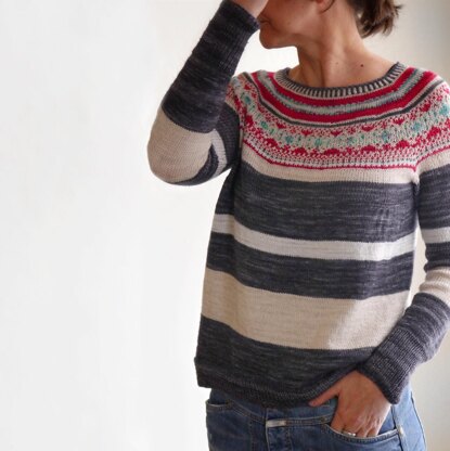 The sweater is worked seamlessly in rounds in one piece from the top-down. After the collar is worked, the colorwork-yoke is shaped by increases for body and sleeves and additional radial increases up to the sleeve separation. Colourwork is a mix of slipped stitches and stranded knitting. The body features some side-pleats at the bust. After the body is completed with color blocks, the previously retired sleeve stitches are placed back on the needles to be worked top-down in the round.