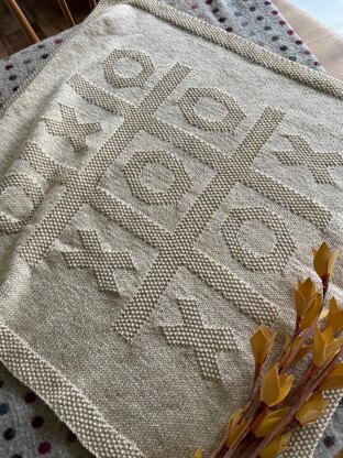 This quirky design mimics the game of Tic Tac Toe or Noughts and Crosses. It’s worked all in one, using just basic knit and purl stitches, and measures approx. 65 x 65 cm (26 x 26 inches) – ideal for a Moses basket, car seat or buggy. You will need to be able to read from charts.