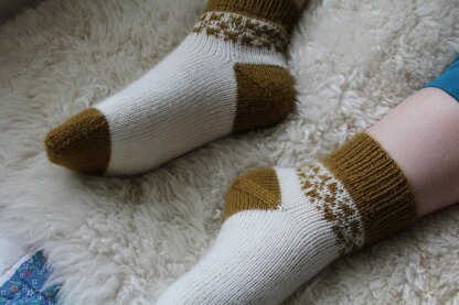 The Nova socks are a fun and quick ankle sock, perfect for cozy winter days. Sizes range from toddler up through adult large, they are a knit for the whole family! Simple two color colorwork with short floats makes these a good project for someone newer to colorwork.
