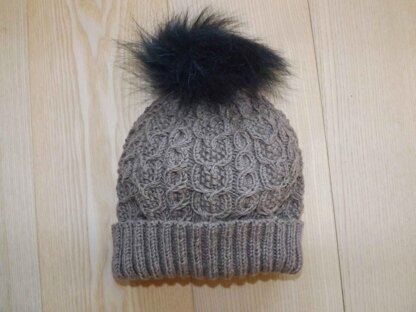 This is a tam/beret worked in the round from the bottom edge and up with a textured allover cable pattern and rib edge. The pattern is made for at yarn with a yardage af 85-90 meters per 50 grams (or a yarn with a yardage of 175 meters per 50 grams held double). The cable pattern has a gauge of 32 stitches per 10 centimeters. The directions is a combination of text and chart.