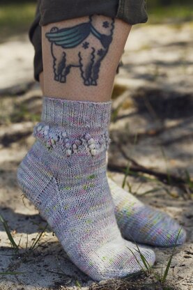 The socks are worked downwards from cuffs to toes. The nupp pattern around the top adds texture to the short leg; the foot and toe are worked in Stockinette stitch. The leg can be lengthened by repeating the chart pattern one or more times or by simply knitting additional rounds before the heel. The foot length is adjustable, and you can make the toe wide or narrow - however you like!