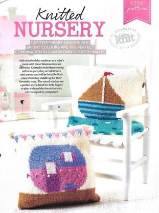 This is a pattern for nursery cushion covers, originally published in Lets Knit. There are two patterns, one for a caravan and one for a sailboat. The backs are in stocking stitch, the fronts in intarsia with embroidery, and the edges in moss stitch with buttonholes. A small amount of red is used on the sailboat version. Photo Lets Knit.