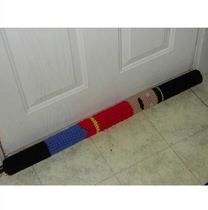 It is perfectly all right for this soldier to be lying down on the job, because that is what he is designed to do: protect your home from all of those cold winter drafts. He is made with worsted weight yarn.