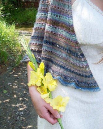 Construction notes This shawl is knit from the top down. The pattern is designed to work with self striping yarns such as Sausalito from Crystal Palace. The eyelet rows are placed so they line up with the color changes, each one dividing one block of color from the next. The colors in sausalito shift subtly, changing one ply at a time. Thus you can add eyelets on each subtle shift, or only when there are major color changes.