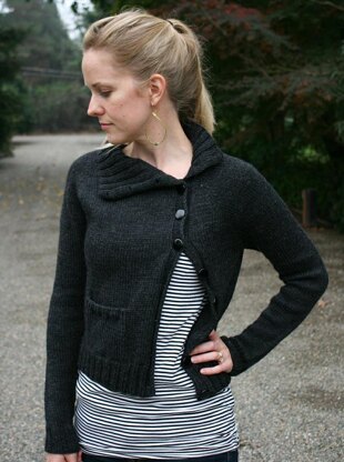Nyx is an asymmetric cardigan inspired by the look of a classic motorcycle jacket. A softened version of the leather perfecto, Nyx features a ribbed collar, long sleeves, and a little pocket for tucking away your winter essentials. The look of the sweater can easily be changed by how it is buttoned and how the collar is worn - standing up or folded down. Construction is simple: Nyx is knit from the top down in one piece with a raglan yoke and waist shaping at the sides. The button bands are worked along with the rest of the piece, making for minimal finishing work.