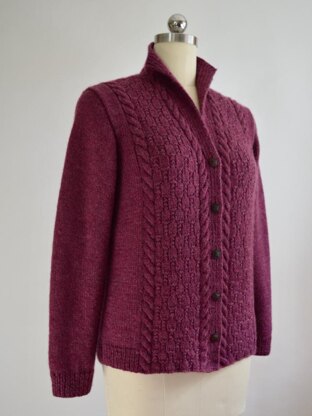 A simple textured pattern edged with cables adds interest to this classic cardigan and the stand up collar is an unusual and elegant touch. Knit in worsted weight, this cardigan is cozy, comfortable, and stylish.