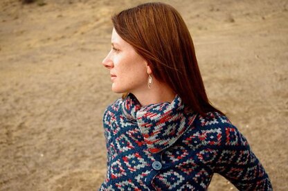 Oblique Motion is a top-down cardigan with an allover diamond colorwork pattern. Cardigan features an upright collar worked in doubleknitting technique that is both reversible and wearable folded up or folded down. The doubleknitting continues down the overlapping front panels so that the underside looks equally pleasing as the outside and provides additional structure. The body and sleeves are worked in normal stranded colorwork knitting, with raglan shoulder shaping. The sleeve cuffs and bottom hem of the body are also worked in doubleknitting so that the fabric lies flat and looks neat on the underside. Cardigan is worked seamlessly and no steek is needed as the colorwork pattern is easy to work on the right side and the wrong side of the fabric.