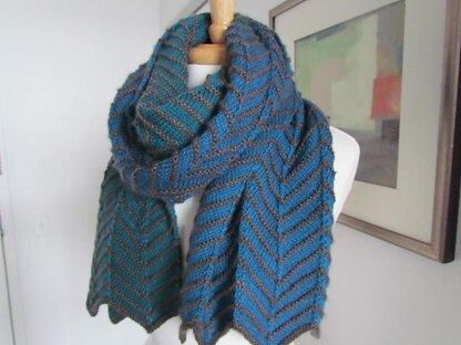 Obsidian is a welted chevron design using 3 different colors. One color is for the welt worked throughout the scarf while the other two colors can be harmonious or complimentary colors used for each half of the scarf. Can be knit in any yarn weight, adjusting needle size accordingly.