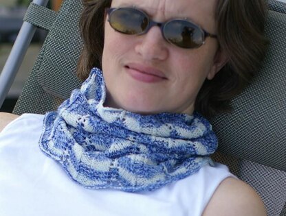 This cowl was inspired by the need for a simple, lightweight garment to keep the chill off while on vacation in the fall at the beach. The stitch pattern echoes the foam-flecked waves of the Atlantic, and the yarn used includes a small amount of chitin, made from the exoskeletons of small invertebrates like shrimp and crabs. The pattern is simple enough to take anywhere, but looks complex enough to impress your friends. It is knit in the round with a rippled lace pattern that is completed in two rounds.