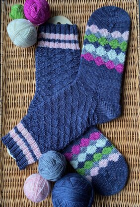 Oddie Socks feature a cheerful band of stranded knitting across the foot. The diamond pattern around the leg is inspired by Gansey style knitting & mirrors the colorwork across the foot. The cuff is topped with a bold stripe detail.