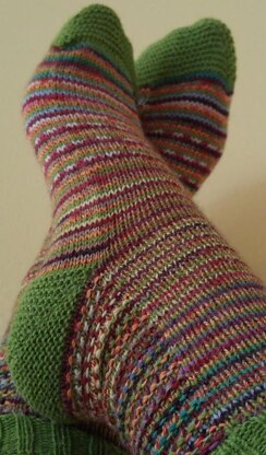 Sizing is easily adjustable by increasing or decreasing the number of stitches in the stockinette sections, and working a longer or shorter foot or leg. You'll need more or less yarn according to your personal changes.