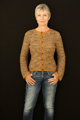 The trim is a tweed pattern using slipped sts. The body commences with and the sleeves finish with tweed pattern. The collar and side trims are also worked in the tweed pattern after picking up stitches along those edges.