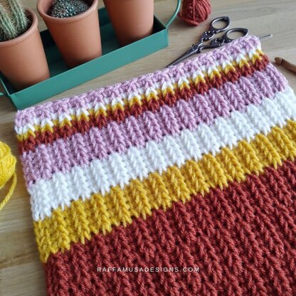 While this Tunisian blanket square is designed to be 12” (30 cm) in size, you can easily customize it to the dimensions you need for your stitch sampler blanket or scrap blanket project.