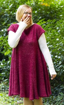 “Ojella” is a dress (or a sweater if you don’t want to work too much!) with simple, flowing lines. It is knit using a combination of two methods: a provisional cast-on is used for the bodice, which is worked bottom up. Then the stitches are picked up for the skirt which is worked top down. Finally, the sleeve stitches are picked up and are worked top down using short rows. All of the edges are folded and hemmed.
