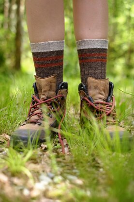 I’ve been out hiking almost every weekend this year and it got me longing for a well thought-out boot sock. I designed these socks to have a traditional look and to include all sorts of great details to make them comfortable, durable, and functional. Reinforced heels and toes mean they’ll stand up to lots of trekking, and ribbing around the ankle and across the narrowest part of the foot offers a good, elastic fit. They’re worked at a dense gauge for a hard-wearing fabric. They’re also a bit taller than standard to go with your favourite hiking boots. The pattern is written for five adult sizes with both straight and shaped calf versions, so knit these up for you and your friends, and head out on an adventure!