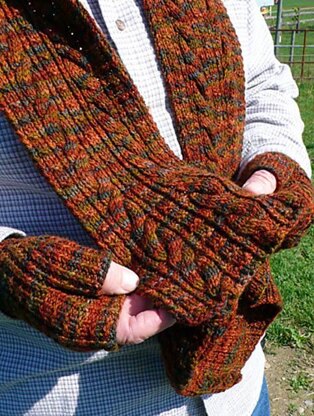 This cozy quick scarf in two sizes features an appealingly tweedy rib-and-cable texture.
